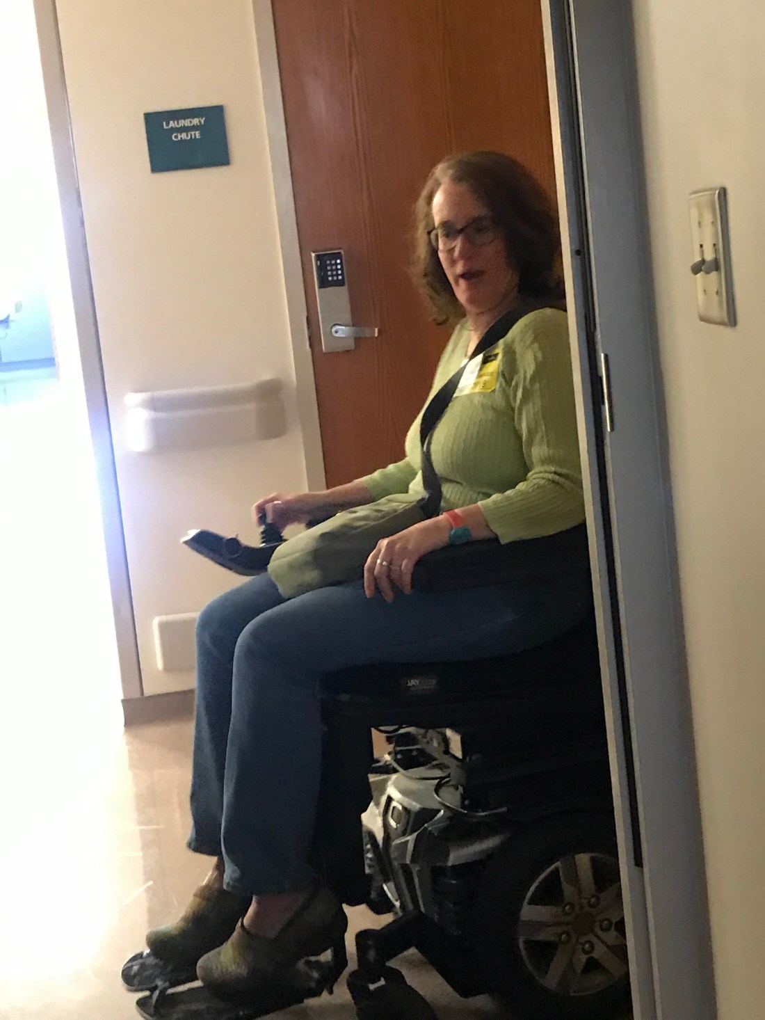 By this point, my husband and two friends had gone home, leaving me with my long time friend, Kristin. They were transporting me to a room, which meant Kristin had to follow us so she could bring my wheelchair to the new room. Once I had asked Kristin to get me a glass of water from my manual chair. Forty-five minutes later she brought me a glass with approximately 1/2 inch of water. So I wasn’t sure how this would go. Neither was the doctor who ended up on the elevator with us. The elevator stopped on his floor before we reached our floor and looking at Kristin, he said, “I will just wait and ride back down.” He had watched her maneuver the chair onto the elevator and felt safer staying in the corner with his feet out of harm’s way.